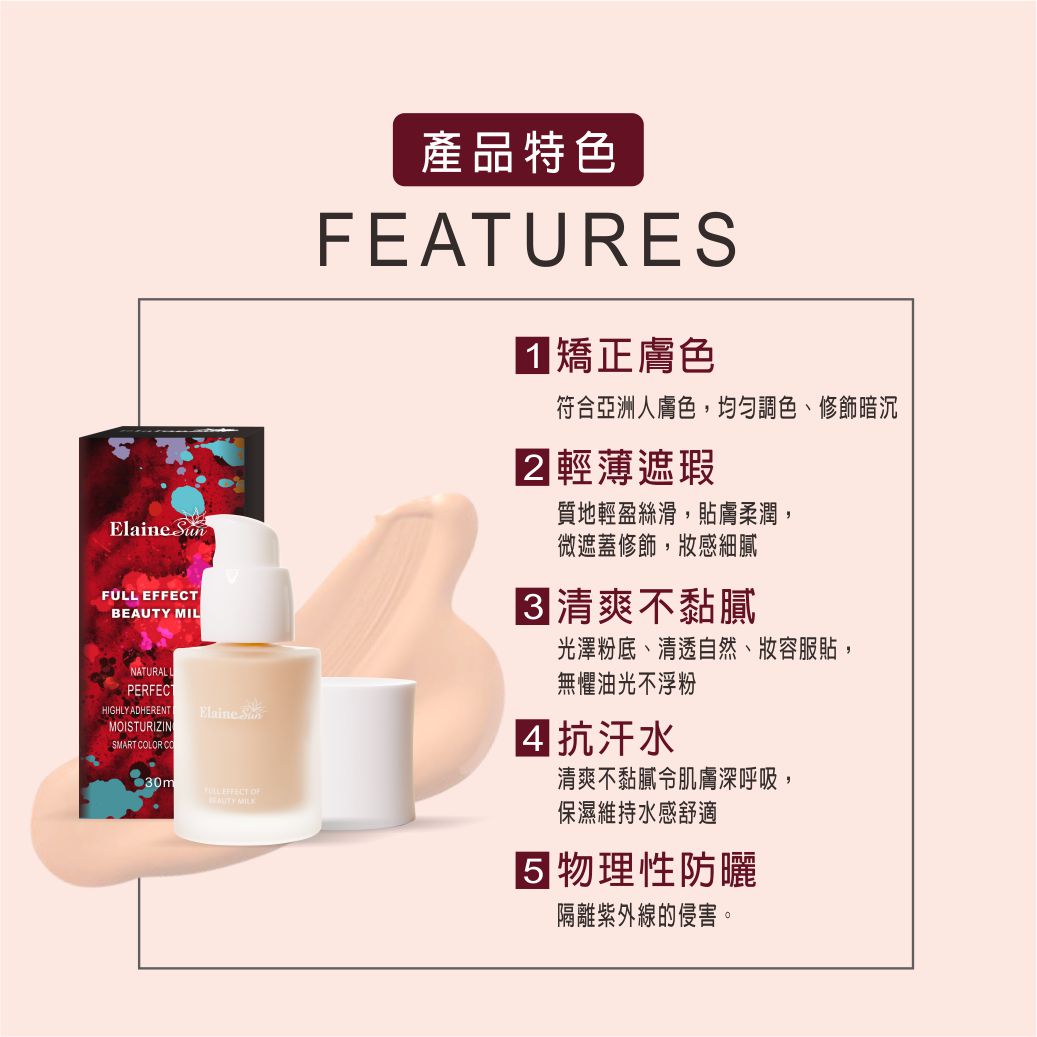 符合亞洲人膚色,一抹光澤奶油肌,具矯正膚色、微遮蓋修飾的特點,抗汗、不易脫妝,維持完美妝容,物理性防曬,隔離紫外線,清爽不黏膩令肌膚深呼吸,保濕維持水感舒適,從早到晚展現透亮光澤感,均勻膚色,肌膚更加細滑,全天候散發自信美感。