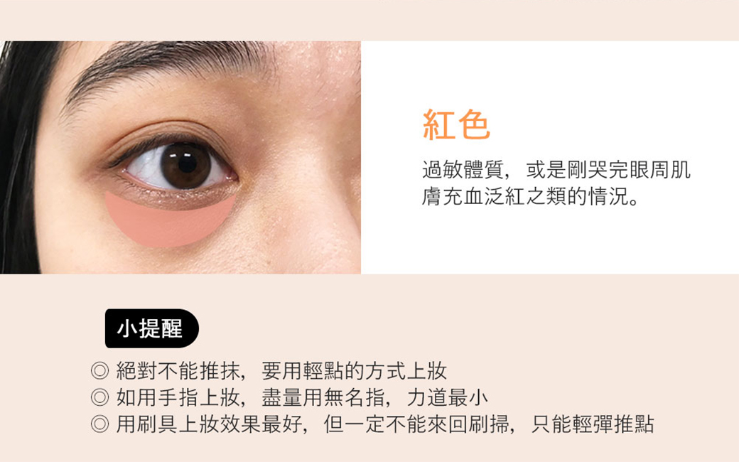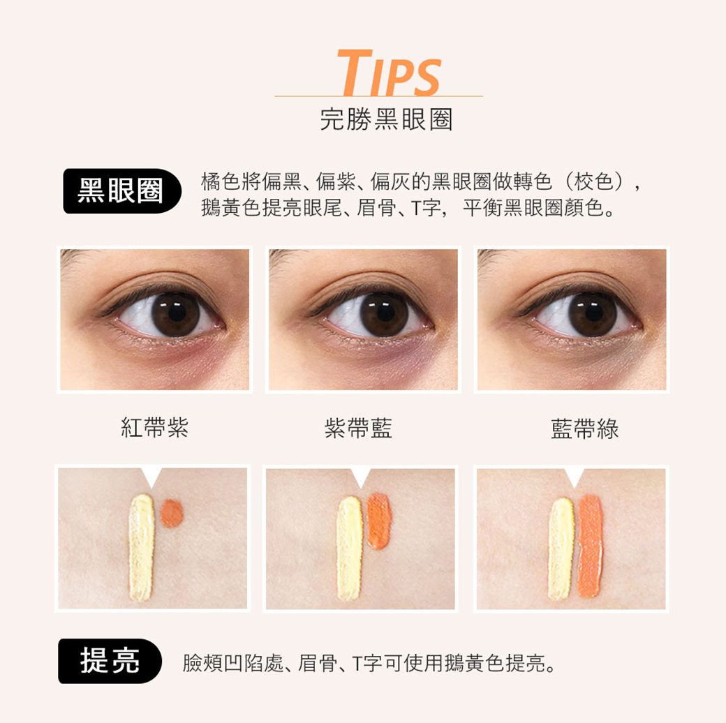 黑眼圈:橘色將偏黑、偏紫、偏灰的黑眼圈做轉色(校色),鵝黃色提亮眼尾、眉骨、T字,平衡黑眼圈顏色。