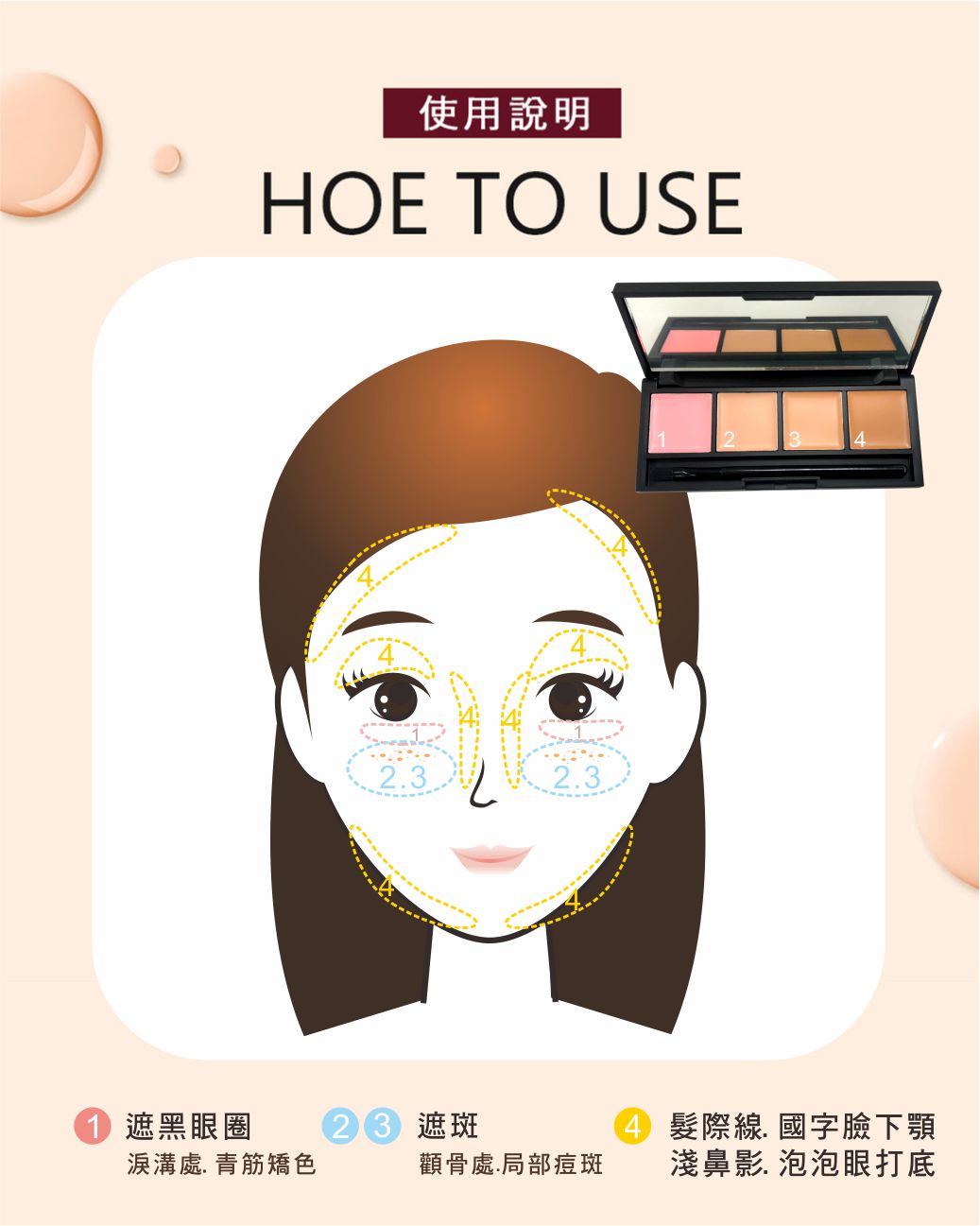 遮黑眼圈:沾取(粉紅色)塗抹於淚溝處改變偏黑、灰、紫色,以手指輕微點壓至服貼為止。