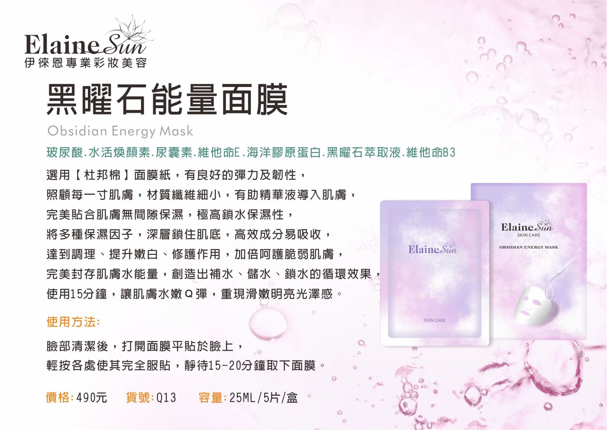 選用【杜邦棉】面膜紙,有良好的彈力及韌性,照顧每一寸肌膚,材質纖維細小,有助精華液導入肌膚,完美貼合肌膚無間隙保濕,極高鎖水保濕性,將多種保濕因子,深層鎖住肌底,高效成分易吸收,達到調理、提升嫩白、修護作用,加倍呵護脆弱肌膚,完美封存肌膚水能量,創造出補水、儲水、鎖水的循環效果,使用15分鐘,讓肌膚水嫩Q彈,重現滑嫩明亮光澤感。