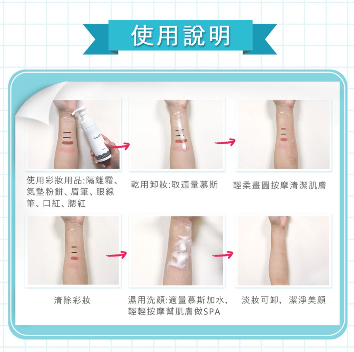 卸妝:手乾臉乾時取適量慕斯於全臉以輕柔畫圓按摩清除彩妝,可更深層清潔毛孔。
