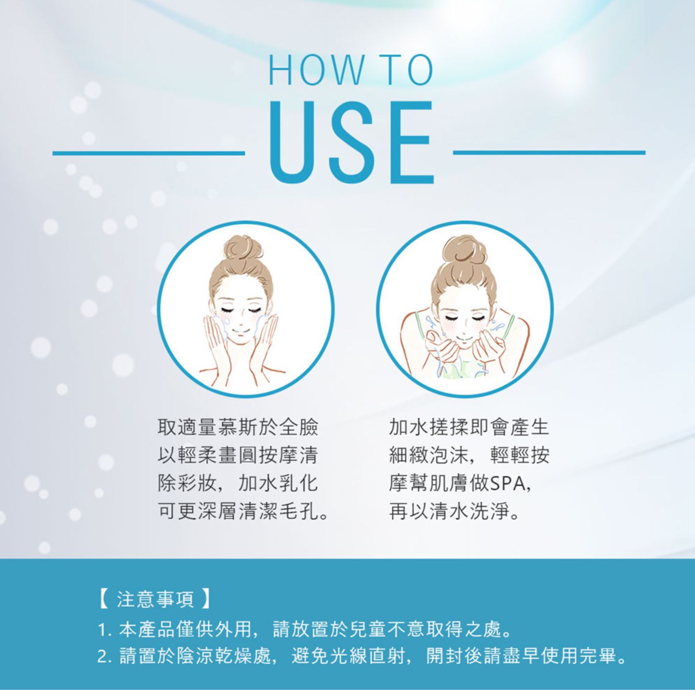 洗顏:將臉拍濕,取適量慕斯輕柔按摩將肌膚做SPA,完整洗淨。